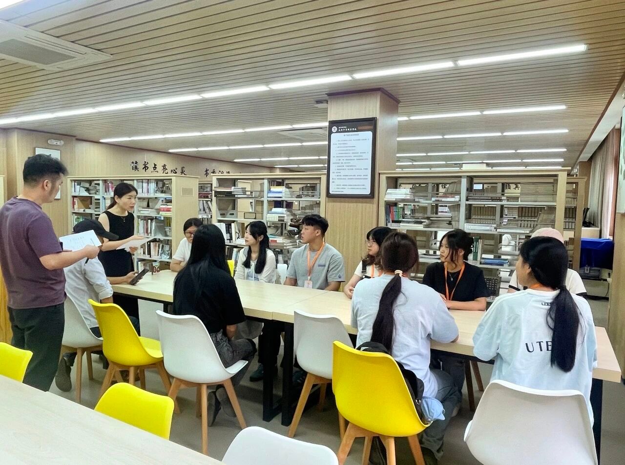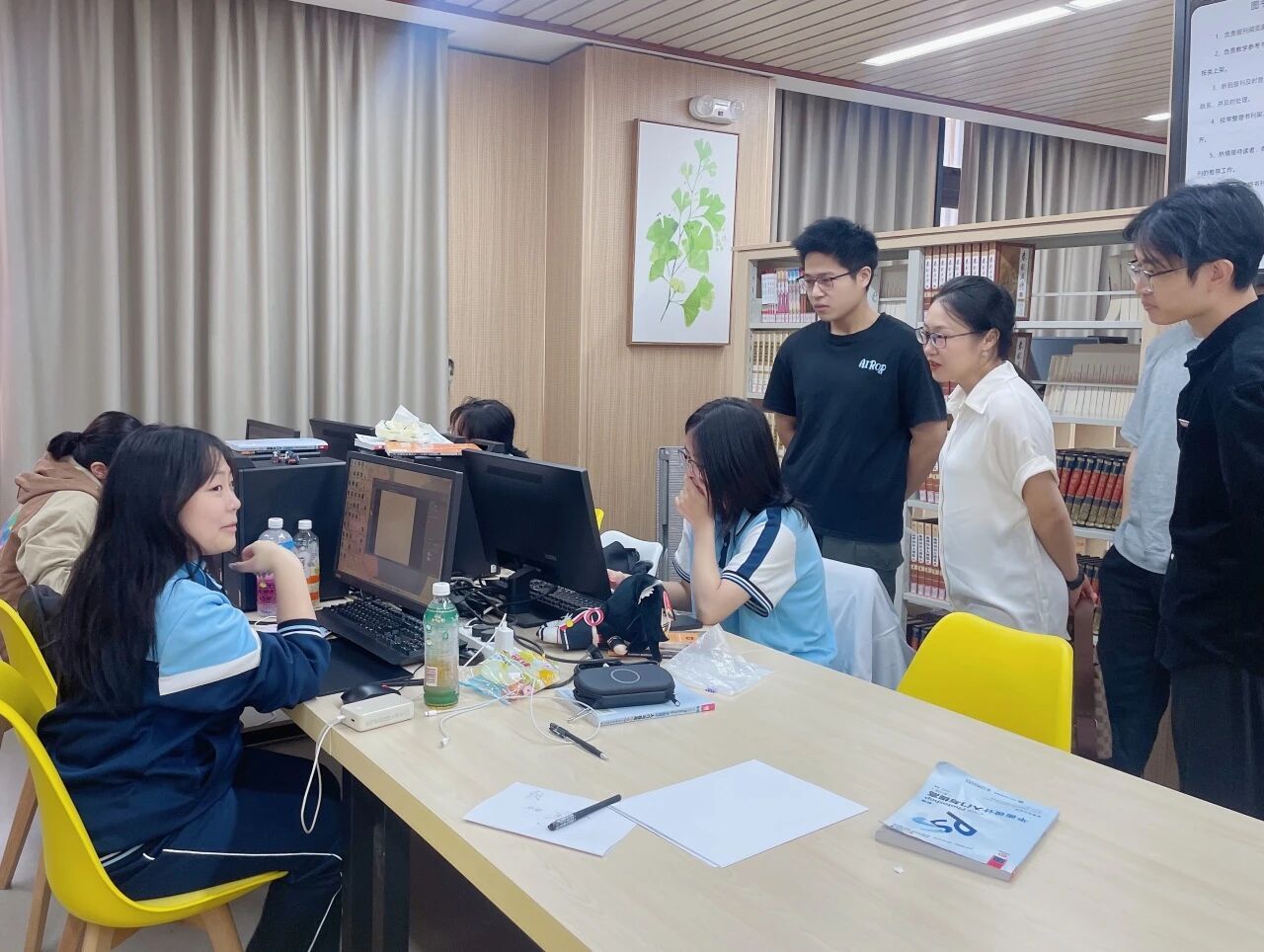 恰逢该校开展学科竞赛特训,22级实习生张先锋因大学期间有过相关竞赛获奖经验,正以指导老师身份参与辅导。林惠仙主任一行随即加入交流,与该校带队参赛的指导老师陈馗、李爱云及参赛学生深入互动:既询问22级学生实习与辅导难点、肯定其实践成果,又结合广告学专业特色,为竞赛主题构思、作品呈现提优化建议,随行指导老师也分享备赛与创意激发经验。