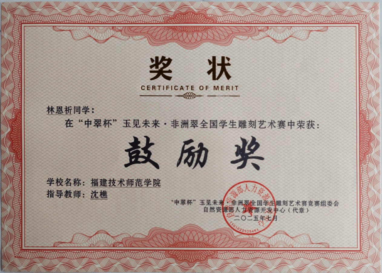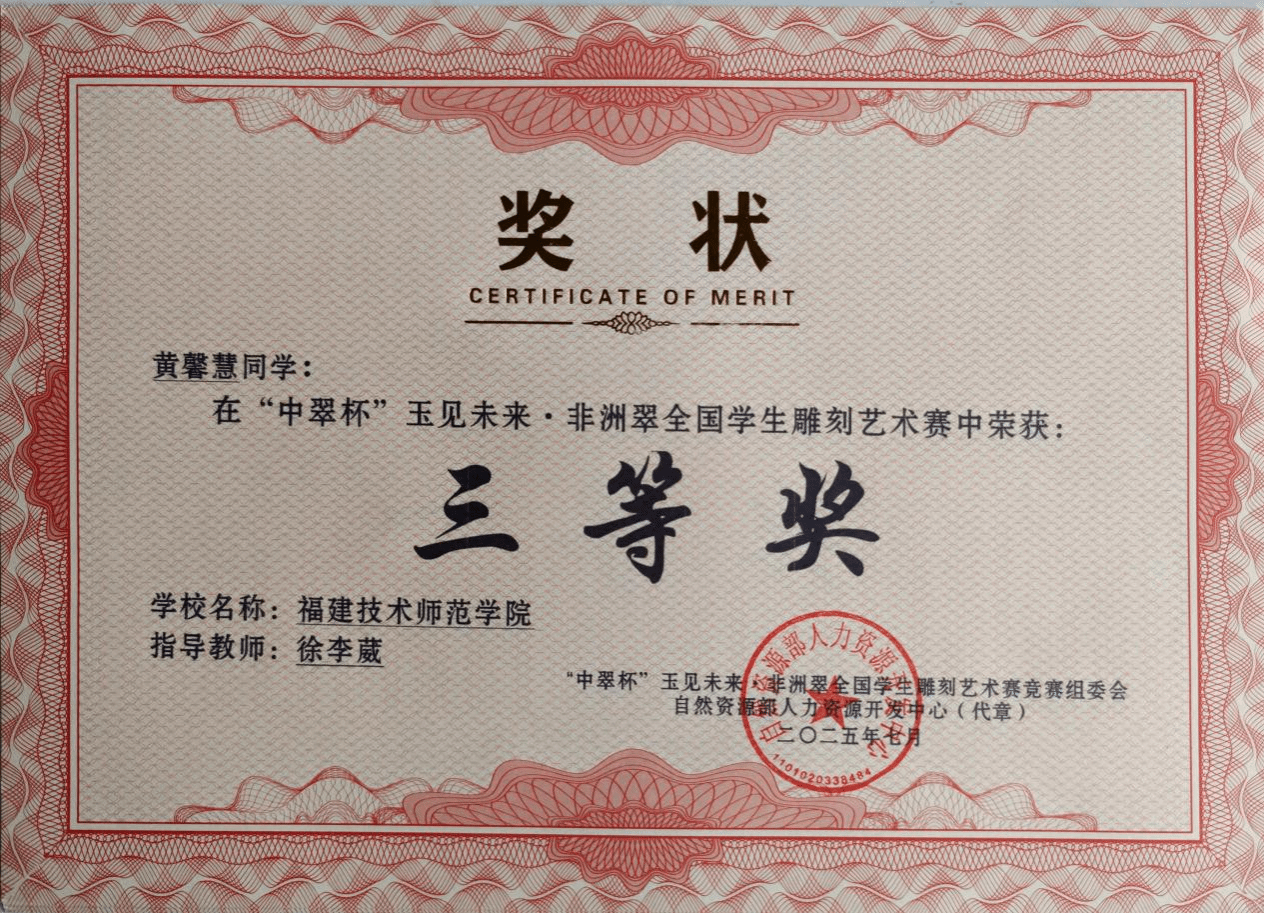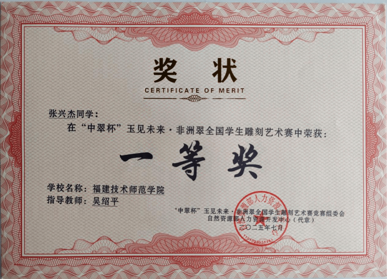 在由自然资源部人力资源开发中心主办的“中翠杯”玉见未来·非洲翠全国学生雕刻艺术赛上,我院工艺美术专业学生获一等奖1项、三等奖1项、鼓励奖1项。