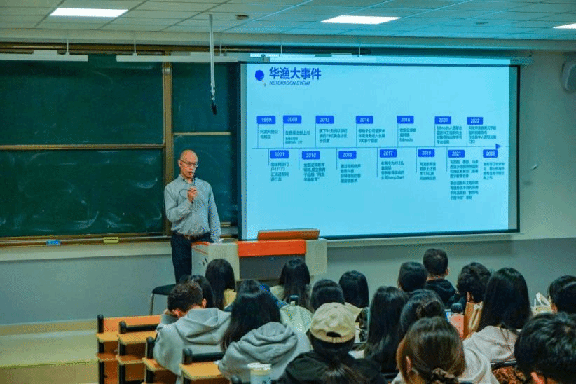 网龙华渔教育销售副总经理高通过一段AI生成的公司简介视频,展示了集团在人工智能领域的战略布局,提出人工智能是大势所趋,勉励同学们把握行业发展脉搏,主动拥抱技术浪潮、顺势而为,在AI赋能的新赛道上抢占先机。