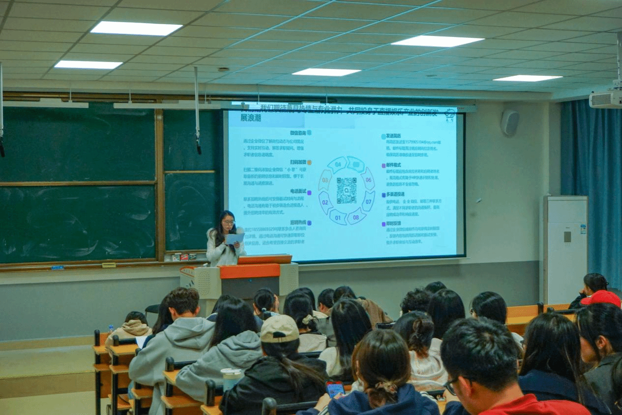 木兮(福州)信息科技有限公司人事负责人张佳敏企业在直播文娱领域的深耕实践为切入点,介绍了企业在运营效率、变现能力和人才成长路径上的显著优势,其在虚拟偶像运营、音频内容制作及多平台资源整合方面的创新实力。她鼓励同学们以积极的心态拥抱文娱行业新趋势,投身声音与直播赛道,在实践中成长为复合型新生力量,并诚挚邀请大家加入木兮科技,携手开拓泛娱乐产业的新可能。
