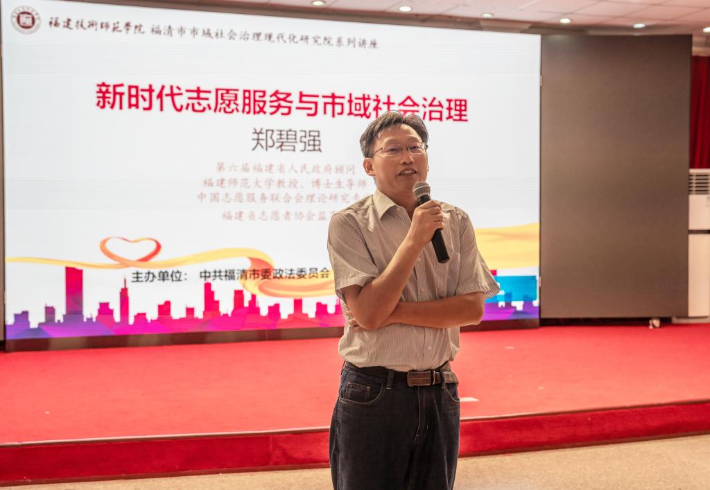 10月15日上午,第六届福建省政府顾问、中国志愿服务联合会理论研究专家、福建省志愿者协会监事长、福建师大博士生导师郑碧强教授,以“新时代志愿服务与市域社会治理”为主题,于我校五马山校区科学楼学术报告厅为师生举行讲座。讲座由我院陈春彦教授主持。