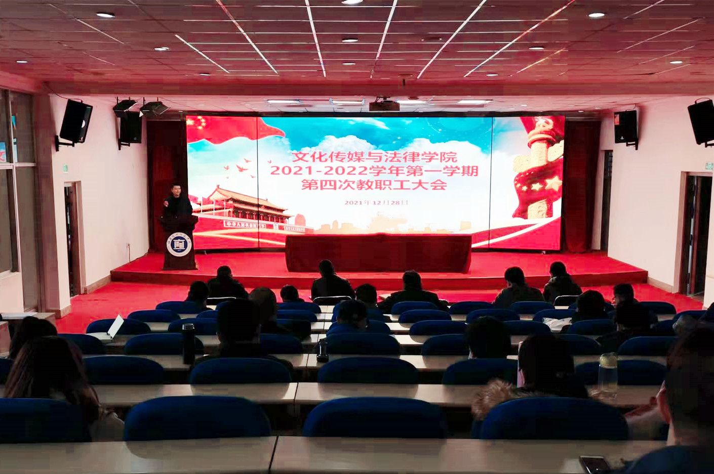 12月28日上午,我院于科学楼学术报告厅召开2021-2022学年第一学期第四次教职工大会。院党委书记郭永云、院长陈致烽,副院长谢西娇和温志拔等全体教职工参会。