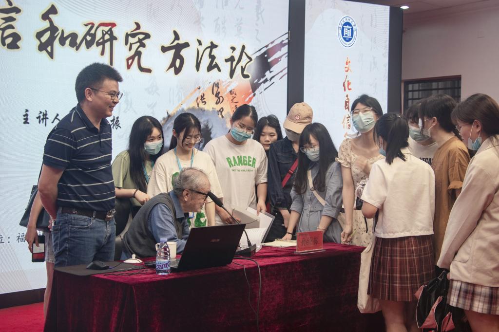 在讲座的尾声,孙绍振教授立足百年未有之大变局这一新时代特点,提纲挈领,收束全文,鼓励年轻人从批判的文化中寻找精华,并再次呼吁青年学生,要用实践的观点看待问题,坚持实践是检验真理的唯一标准,建立自我正确的世界观和方法论,唤醒自身民族文化血脉中的“刚性”,塑造民族文化人格,增强对自我文化的认同感和自豪感。随后,他特地空出一定时间,与青年师生积极互动交流,就与会师生朋友提出的问题,如“如何避免文化自信走向民粹主义”“如何看待汉文化‘热’现象”等,均作了耐心而细致的回答,进一步剖析文化自信的精神内涵,使师生对文化现象和常识性结论有了更为全面的认识和深入的思考。