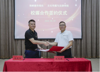 签约仪式上,我院院长陈致烽与福建日报社编委、海峡都市报社社长刘见闻代表双方签订战略合作协议,双方将在实训基地设立、宣传平台共建、人才互动交流等方面开展深度合作。此次校媒合作有助于文化传媒与法律学院产教融合的进一步发展,有助于为高校学生提供更优质的实习实训平台,有助于校媒双方在各自转型发展过程中携手并进。