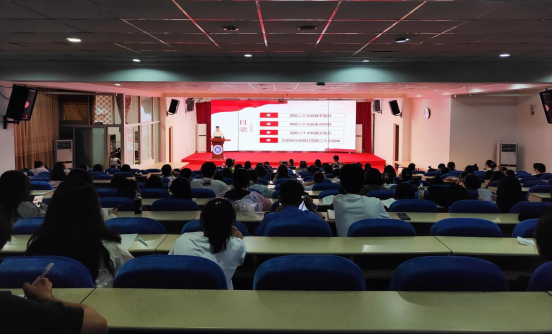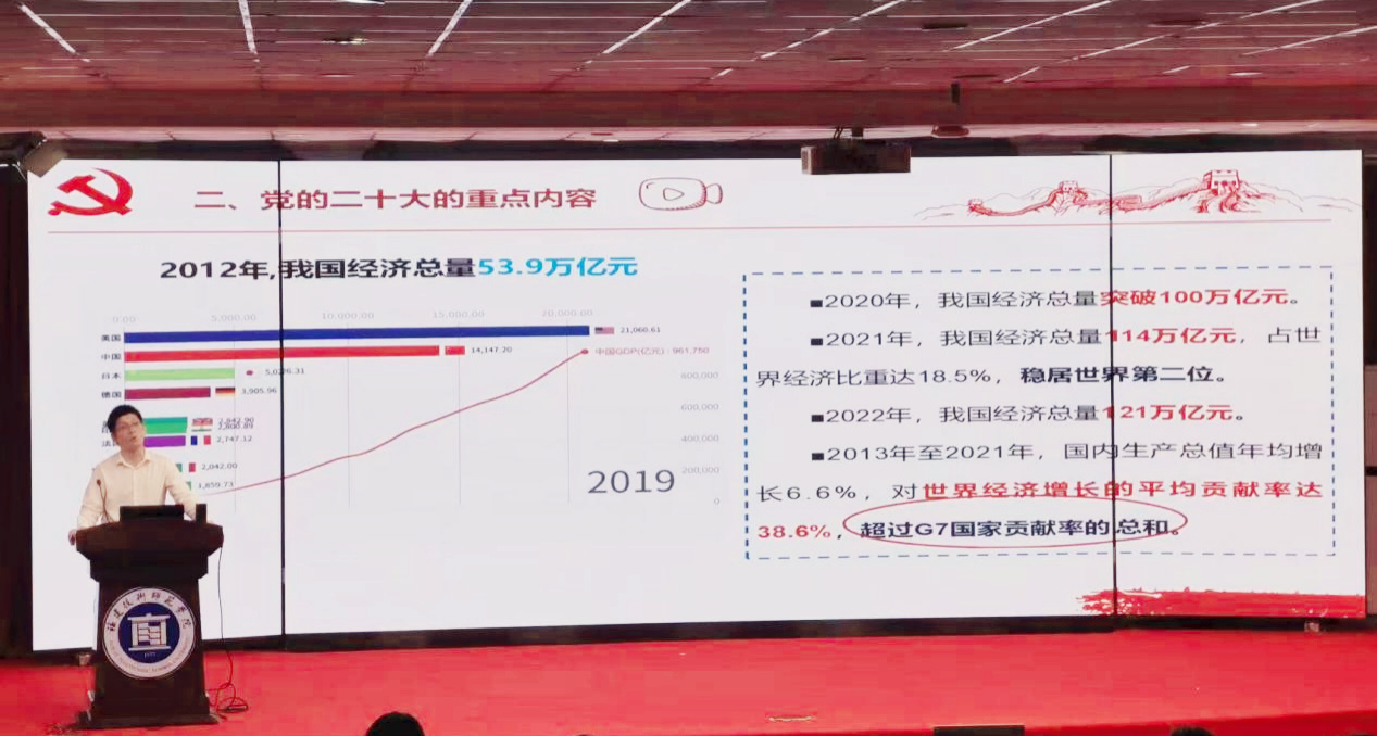 接着,陈教授通过提取报告中的关键字,结合实际生活的方法,全方面、多领域地向同学们展现了中国特色社会主义建设新时代取得的显著成果;从“过去五年的工作和新时代十年的伟大变革、开辟马克思中国化新时代新境界、新时代新征程中国共产党的使命任务、加快构建新发展格局,着力推动高质量发展、实施科教兴国战略,强化现代化建设人才支撑”等方面对二十大报告的主要内容进行了详细解读,让同学们深刻意识到青年工作的重要性。