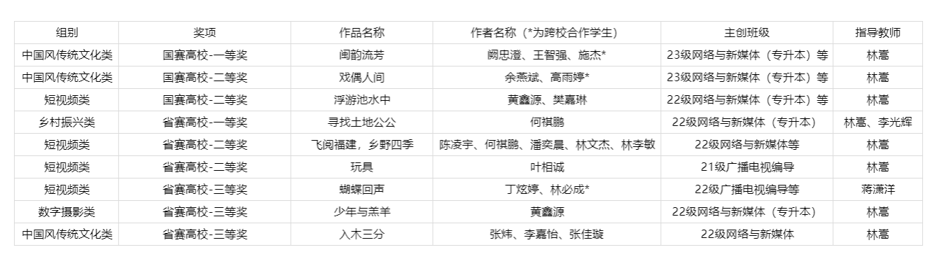 经过多月评比,最终23网媒(专升本)阙忠澄、王智强的纪录片《闽韵流芳》获得中国风传统文化类全国一等奖,23网媒(专升本)余燕斌的纪录片《戏偶人间》获得中国风传统文化类全国二等奖,22网媒(专升本)黄鑫源、23网媒(专升本)樊嘉琳的剧情片《浮游池水中》获得短视频类全国二等奖,此外还有22网媒(专升本)何祺鹏的纪录片《寻找土地公公》获得乡村振兴类省一等奖等。