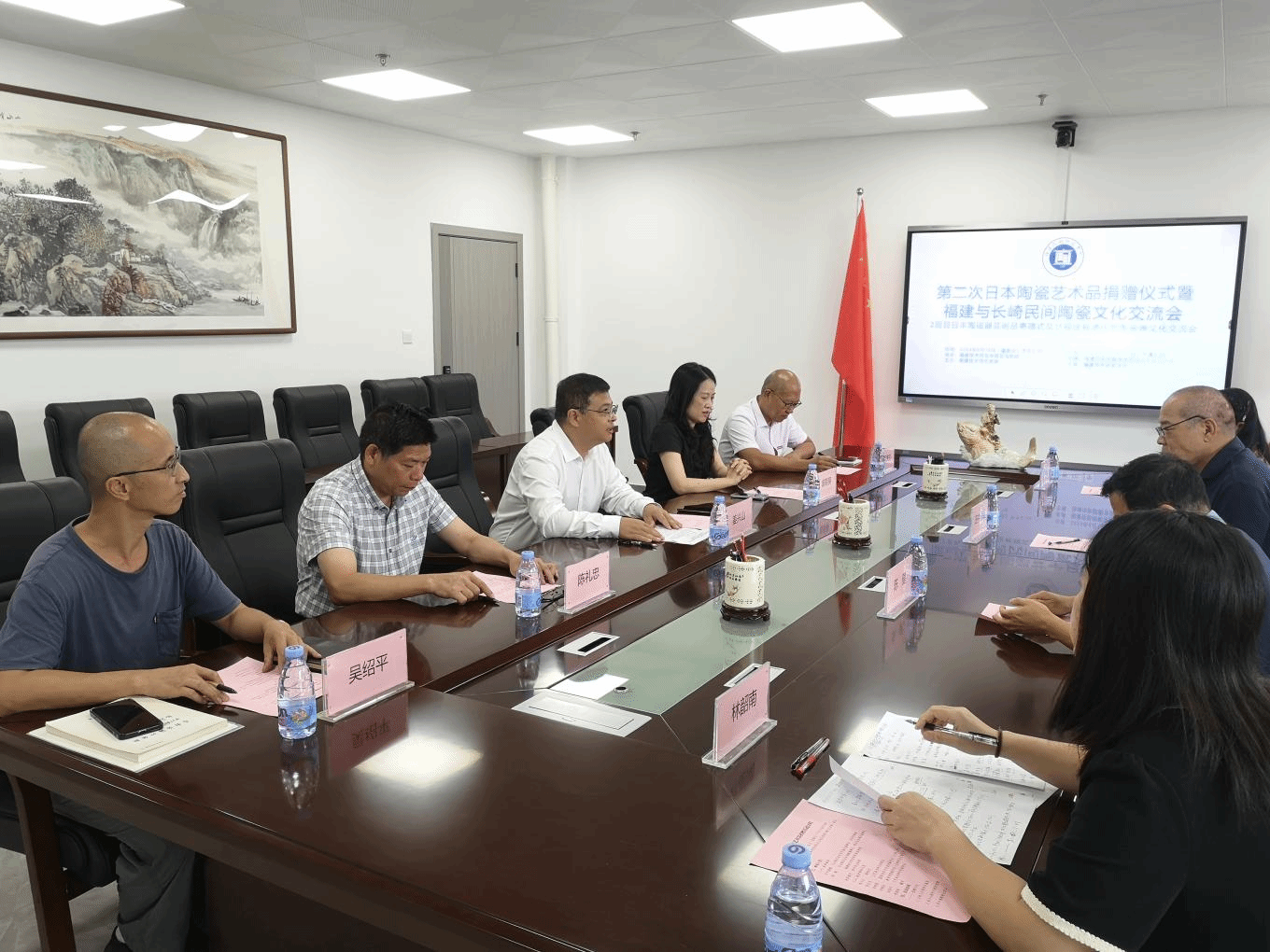 8月18日,日本株式会社田中油压董事长、民间收藏家田中满雄先生第二次到访学校,日本株式会社BBM董事长、株式会社福友董事长陈健,田中先生助理柄泽博子女士陪同访问。田中先生第二次向学校捐赠了陶瓷艺术品11件,姜兴山副校长代表学校在林联兴楼第一会议室接受捐赠。国际合作与交流处、艺术与传媒学院、教育学院、工艺美术研究院等相关负责人出席捐赠仪式。