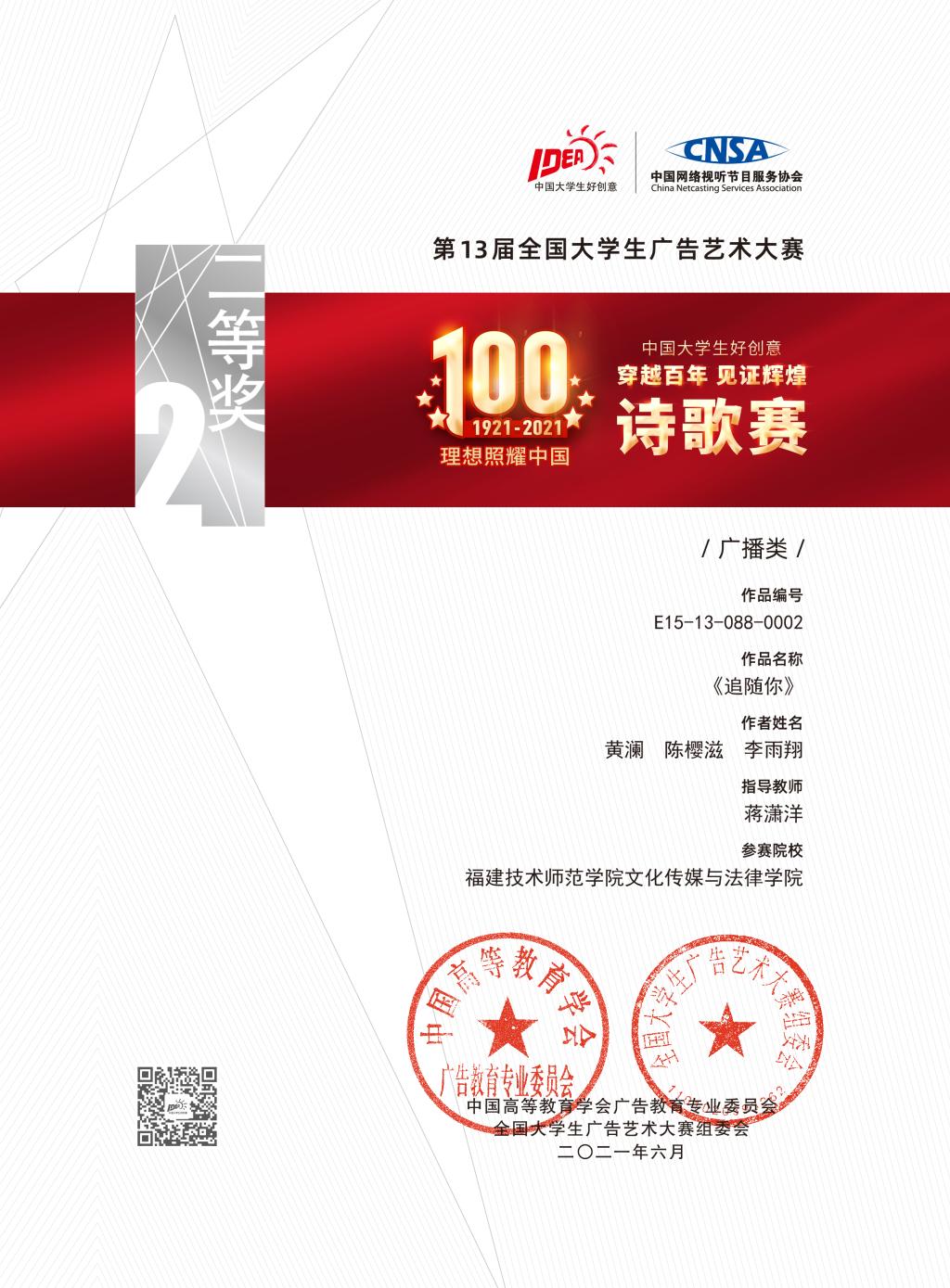 近日,由教育部高等教育司指导的第13届全国大学生广告艺术大赛“理想照耀中国 • 中国大学生好创意 穿越百年见证辉煌 诗歌赛”评审结束并公布获奖名单,我院1件学生作品榜上有名。