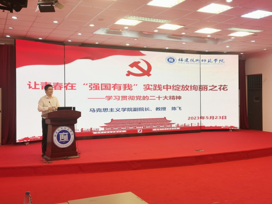 未来属于青年,希望寄予青年,青年是建设国家的主力军。为提高青年学生的政治素养、引导他们深入学习和贯彻党的二十大精神,5月23日晚,我院邀请马克思主义学院副院长陈飞教授在科学报告厅讲授《让青春在“强国有我”实践中绽放绚丽之花——学习党的二十大精神》主题党课。我院2023年上半年入党积极分子培训班全体学员等参加学习。