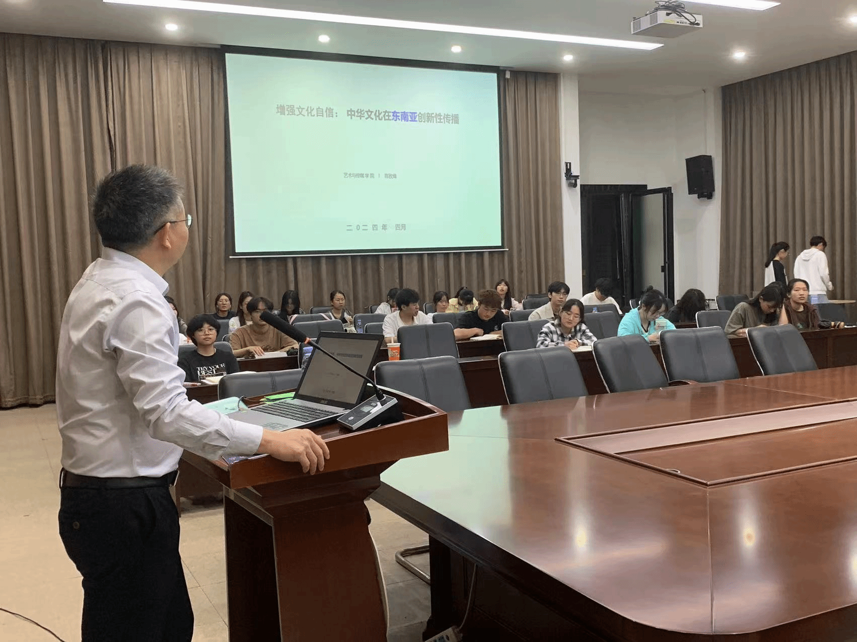 4月24日晚上,艺术与传媒学院在图书馆报告厅举办了一场特别的党课活动。本次党课由学院院长、教授陈致烽主讲,主题为“增强文化自信:中华文化在东南亚创新性传播”。第八期积极分子和部分师生党员齐聚一堂,共同聆听这场深刻而富有启示的讲座。