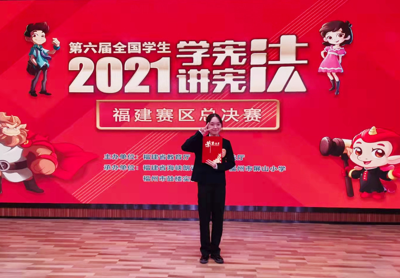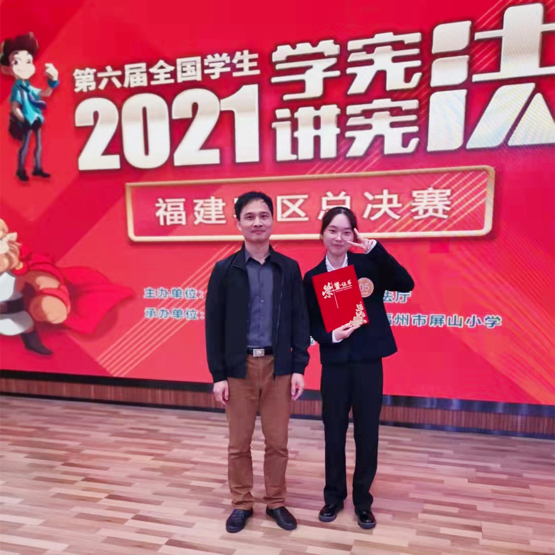 10月23日—24日, 第六届全国学生“学宪法讲宪法”活动福建赛区总决赛在福州市举行。活动由福建省教育厅、福建省司法厅主办,福建省海峡朗诵艺术团、福州市屏山小学、福州市鼓楼实验小学承办。经过两天激烈角逐,我院2019级法学专业学生:方欣 获得知识竞赛高校组三等奖,指导老师:张剑平。
