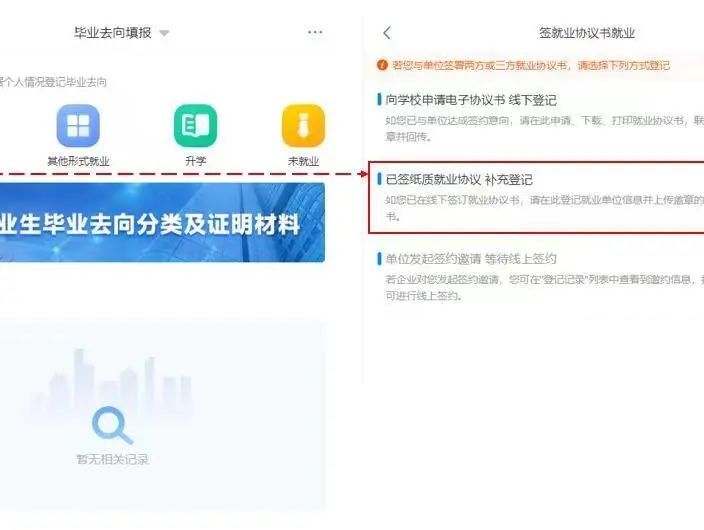 『已签纸质就业协议书补充登记』此功能适用于已经与用人单位签订了纸质就业协议书,需补充登记就业信息的毕业生。