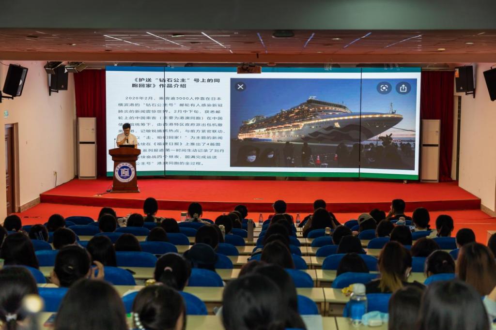 卢金福校友生动地介绍了由他主创的中国新闻奖一等奖获奖作品——《护送“钻石公主”号上的同胞回家》系列报道背后的精彩故事:连线采访中国驻日大使馆总领事詹孔朝的难忘过程;与香港保安局副局长区志光等官方人员的深入沟通;旅日华侨刘丹蕻用两条红色围巾亲手制作“走,咱们回家”的横幅......
