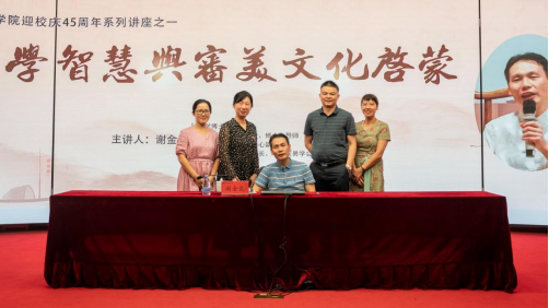 我院迎四十五周年校庆系列讲座正式开讲。9月30日下午,复旦大学中文系教授、博士生导师、国际易学联合会副会长谢金良教授应邀为我院师生做题为《易学智慧与审美文化启蒙》的专题讲座。我院院长陈致烽、副院长谢西娇、部分教师代表和汉语言文学专业的学生到场聆听。讲座由谢西娇副院长主持。