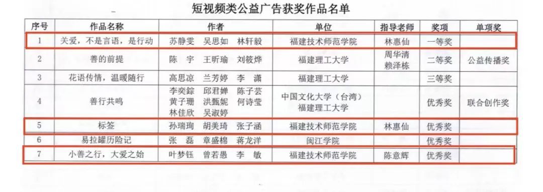 首届海峡两岸(福州)大学生公益广告设计大赛是国务院台湾事务办公室、中华全国青年联合会、福建省人民政府主办第十二届海峡青年节的两岸大学生创意交流项目。大赛共收到来自海峡两岸20所高校271件(411幅)作品。其中,大陆参赛院校17所,台湾参赛院校3所。共评选出一等奖3件、二等奖4件、三等奖5件,优秀奖87件;公益传播奖3件;联合创作奖3件、联合创作佳作奖3件。(名单如下)