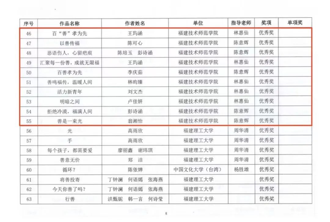 日前,2024年首届海峡两岸(福州)大学生公益广告创意大赛获奖名单揭晓,我校获“优秀组织奖”荣誉称号,艺术与传媒学院林惠仙、陈意辉、宫大成、林嵩、付晶晶 、何燕燕、林航等7名教师获“优秀指导教师”荣誉称号,广告学(师范)专业学子勇夺40个奖项,其中一等奖1项、三等奖3项、公益传播奖1项。