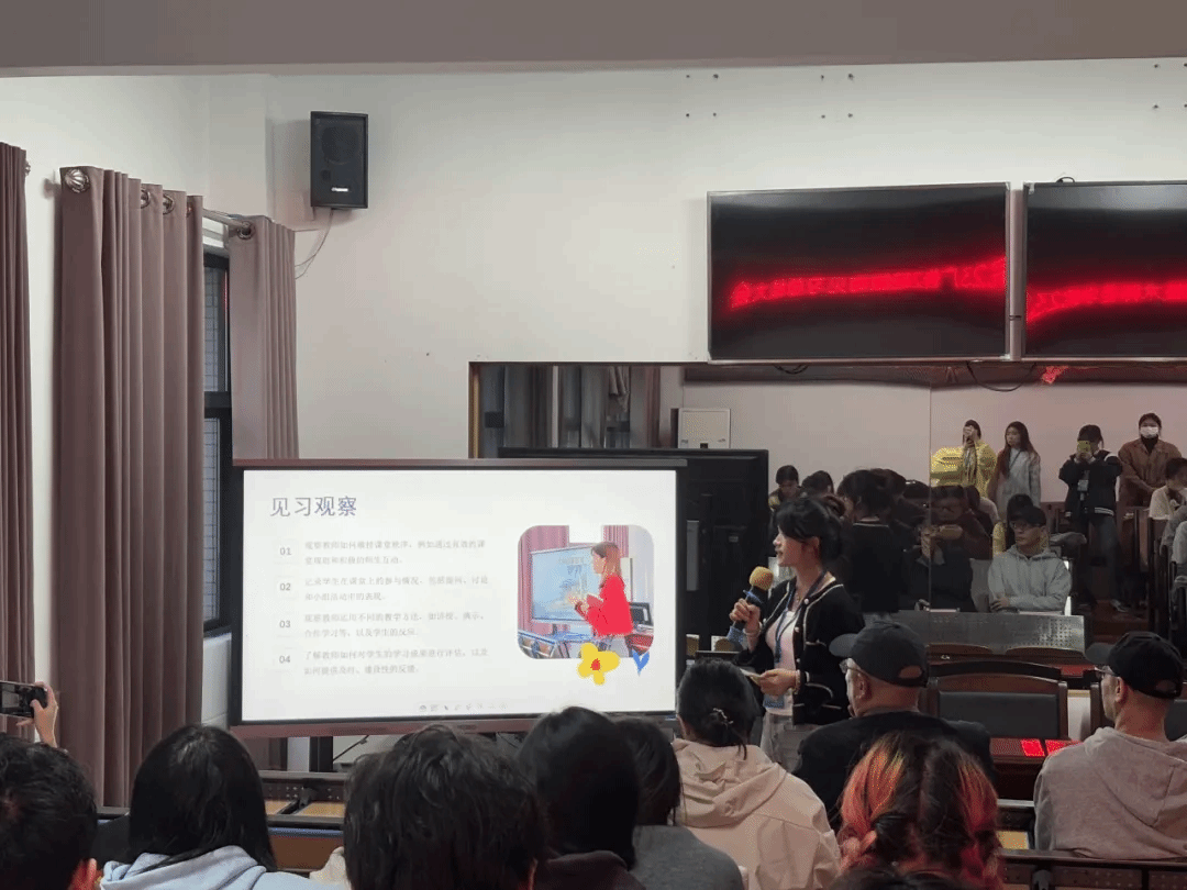 总结会上,各小组组长逐一上台分享一周的见习成果,从听课感悟、班级管理策略、教研活动参与等多个角度进行了生动的交流,表达了对见习学校的文化底蕴、教育教学理念及教师职业的新认识和理解。同学们深刻认识到作为一名教师,不仅要有扎实的学科知识,更要掌握灵活多样的教学方法,关注学生的个体差异,用心营造积极活跃的课堂。